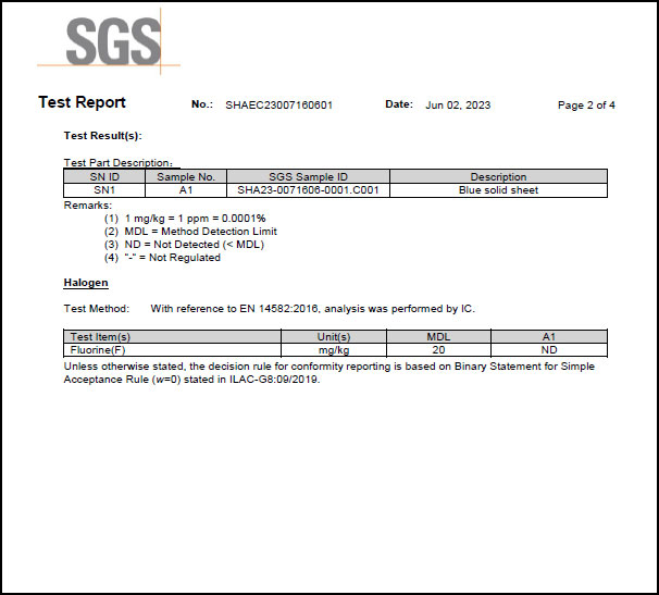 為滿足客戶(hù)需求,近日SealTex索 ST-2058無(wú)石棉板通過(guò)了SGS進(jìn)行的鹵素(氟)檢測(cè),檢測(cè)標(biāo)準(zhǔn)EN 14582-2016,報(bào)告顯示未測(cè)出氟,報(bào)告部分截圖如下: